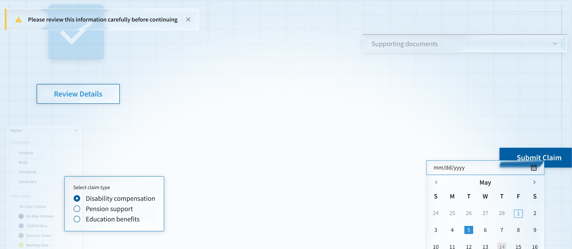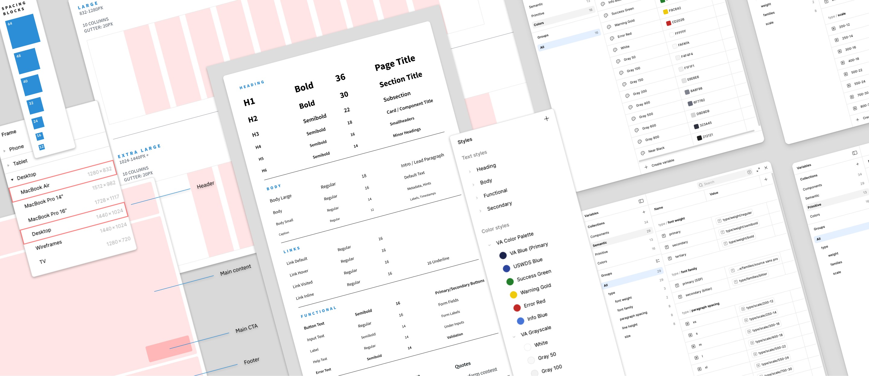 I established a foundation of typography, color variables, and layout systems—structured across primitive, semantic, and component layers—to ensure consistency, scalability, and accessibility, while identifying and addressing gaps in the VA design guidance.