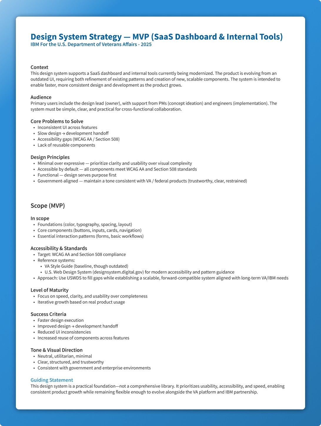Grounded in WCAG AA and Section 508 compliance, the system establishes a scalable foundation for delivering consistent, accessible experiences to veterans while improving design velocity and strengthening collaboration between design and engineering.